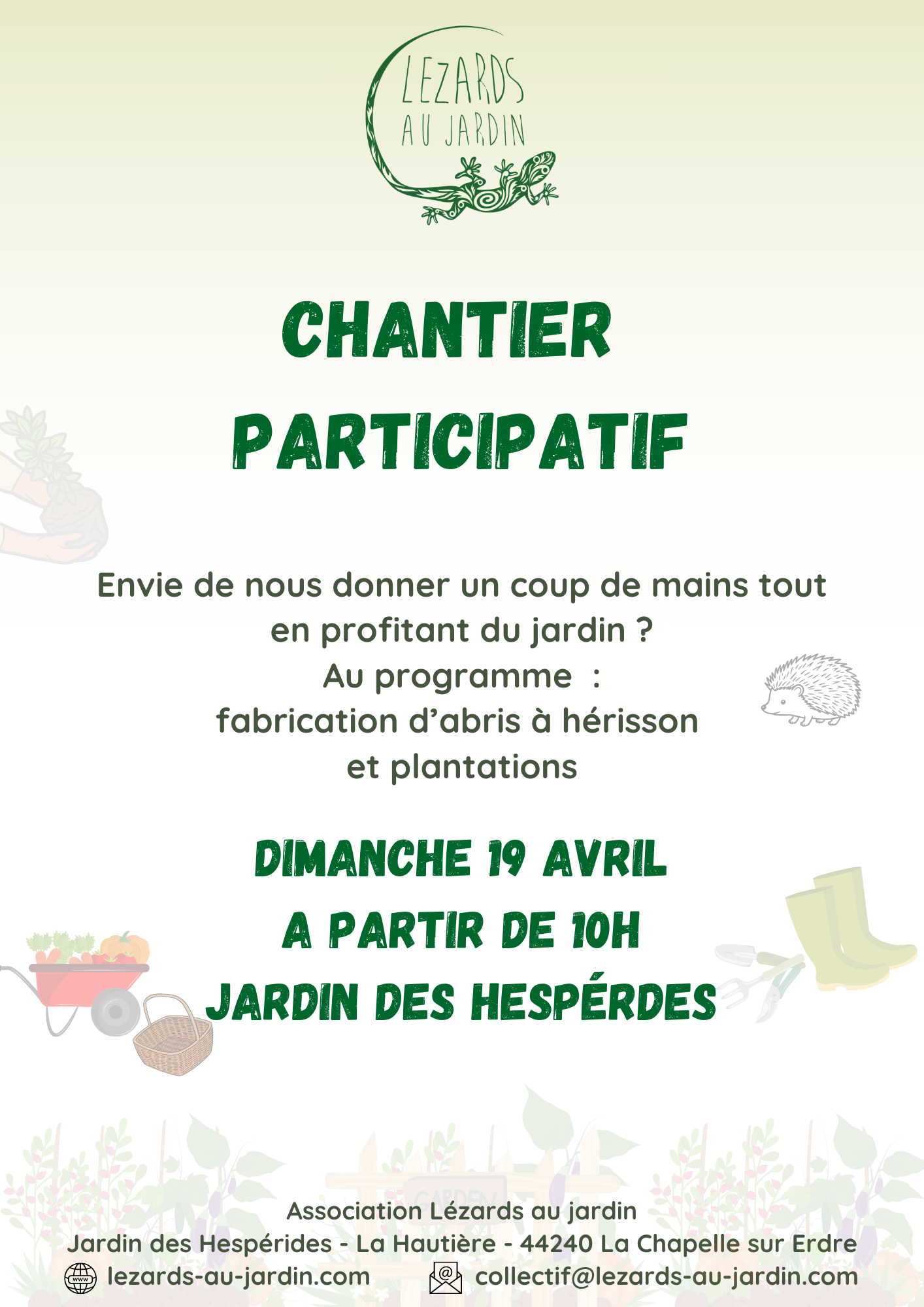Rejoignez-nous pour notre chantier participatif mensuel.Au programme : fabrication d'abri à hérisson, plantation des semis qui auront réussi, entretien du jardinAu plaisir de vous retrouver |